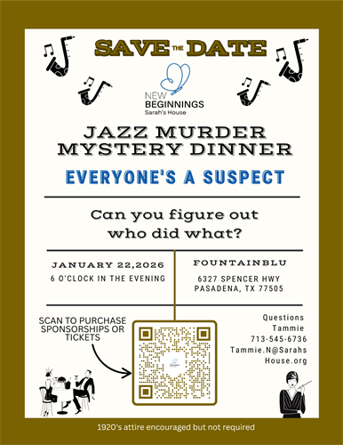 Event Description:Step into a 1920s-themed Jazz Murder Mystery Dinner where everyone is a suspect. Enjoy an unforgettable night of intrigue, dinner, and live mystery while supporting New Beginnings Sarah’s House.