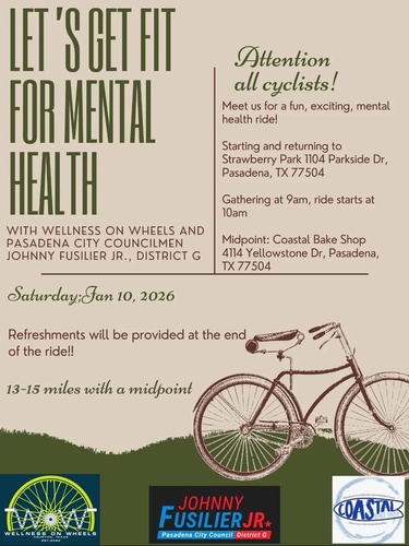 Name: Wellness on Wheels Community Bike RideDate: January 10, 2026Time: 9:00 AM - 12:00 PM CSTEvent Description:Attention all cyclists! Let's get fit for mental health on Saturday January 10th with Wellness on Wheels, Coastal Bake Shop, and Pasadena City Councilman Johnny Fusilier Jr.